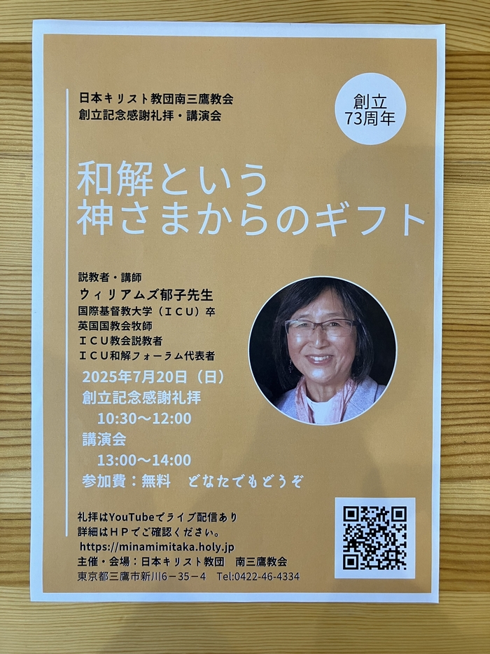 2025年7月20日 / 最終更新日 : 2025年7月24日 mnmmtk 創立73周年記念感謝礼拝 本日の主日礼拝は教会創立73周年の記念日を覚えて行われました。 本年は説教者にウイリアムズ郁子先生(英国国教会司祭、国際基督教大学教会説教者)をお迎えして礼拝が守られました。 礼拝後に恒例の愛餐会が行われ、交わりのひと時を持ちました。 午後はウイリアムズ郁子先生講演会「和解という神さまからのギフト」が開催されました。