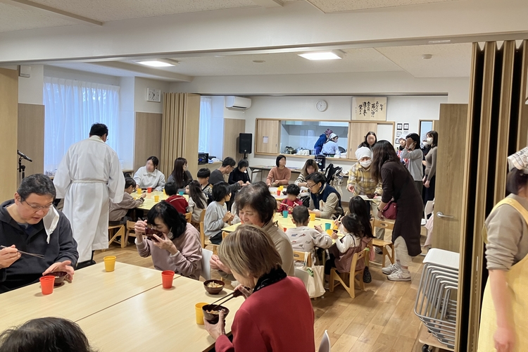 2025年11月23日 / 最終更新日 : 2025年12月2日 mnmmtk 収穫感謝・こども祝福 大人とこども共に守る礼拝 本日の礼拝は「大人とこども共に守る礼拝」として幼児から歳を重ねた者までが一つの礼拝をささげました。 大人の礼拝では伴奏にオルガンを使用しますが、本日はピアノです。 礼拝には大人とこどもが一緒に参加しました。 礼拝の後、こども祝福式が行われました。 お手製のお味噌を使った「秋のめぐみ汁」です。 みんなで歓談しながら美味しく頂きました。