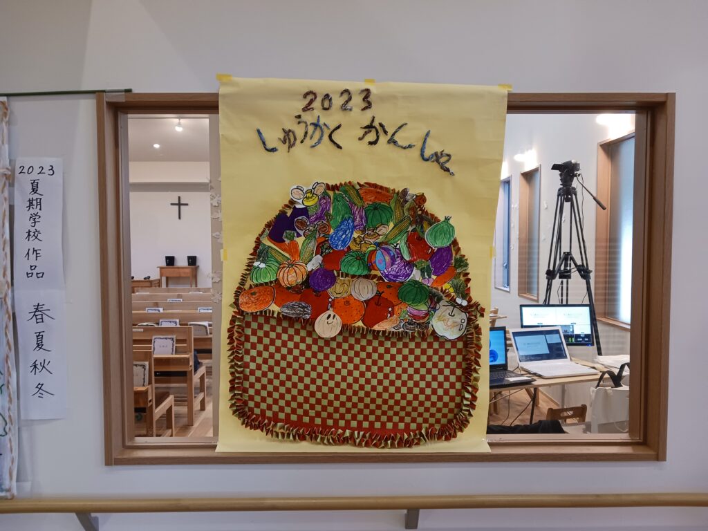 2023年11月26日 / 最終更新日 : 2023年11月26日 mnmmtk 2023収穫感謝・こども祝福式 日曜学校のこども礼拝と幼児礼拝は合同で、礼拝後にはこども祝福式がおこなわれました。収穫を感謝して大きなバスケットに秋の野菜が盛りつけられました! 礼拝堂には野菜やお花が飾られました。