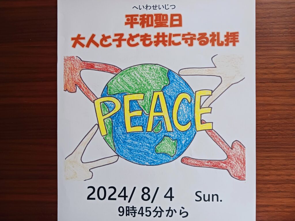 2024年8月14日 / 最終更新日 : 2024年8月14日 mnmmtk 平和聖日2024 8月4日大人と子ども共に守る礼拝をささげました。こどもさんびか140を用いて世界各国の言葉で平和を唱えました。そして大人と子どもみんなで握手して聖書の言葉「シャローム」の挨拶を交わしました。